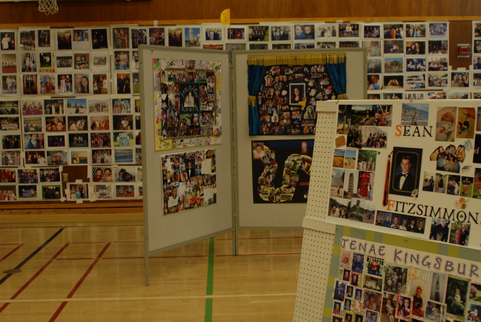 As you enter the small gym, there are moms working on the wallpaper of pictures that go all the way around the entire room. I turned in about 40 old pictures, blown up to 8.5 x 11, and so did many other parents. These picture the wallpaper is made up of, have to include more than one senior and can be taken from their early childhood up to current photos. There are many pictures of birthday parties, grade school field trips, just playmates, etc lining the room.