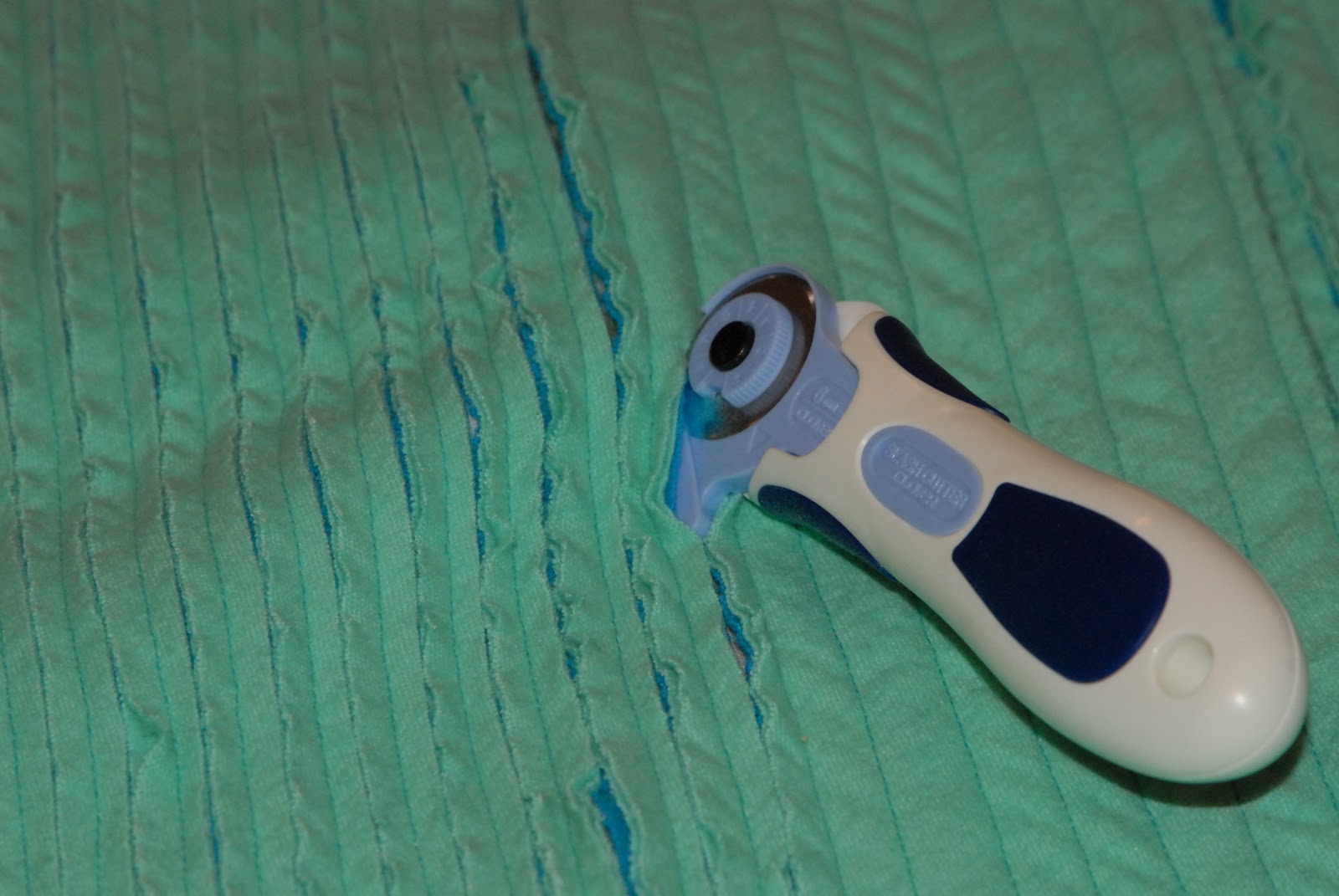 Then I cut all 3 layers of flannel between the rows of stitching, being careful to not cut the fashion fabric on the front of the blanket. I used this handy dandy little tool that I got online cause I couldn't find it in the fabric stores. It is a slash cutter by Clover.