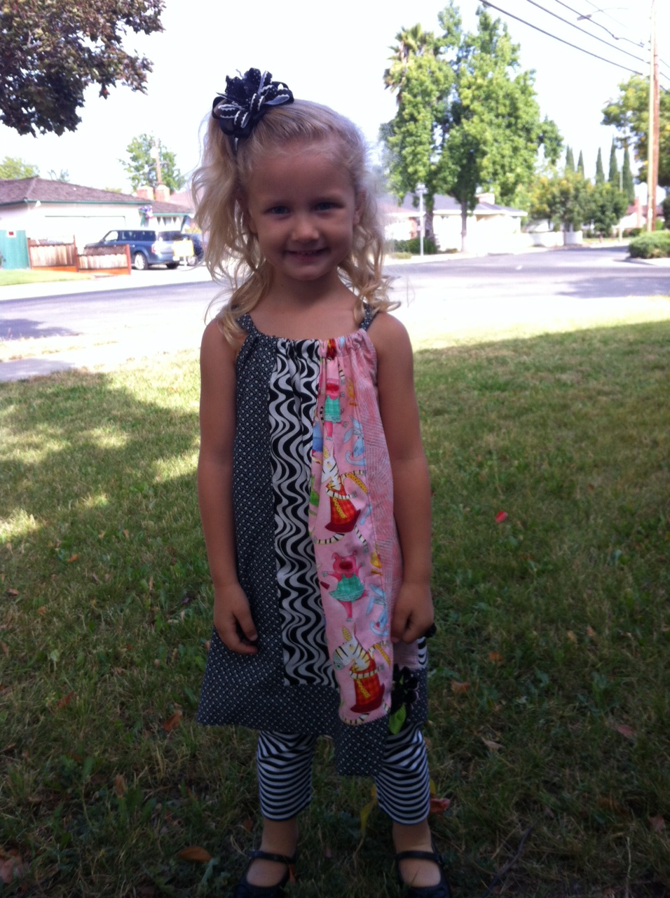 A couple weeks later I made the other girls each a dress. L-2's is black and white with a little pink thrown in for interest. I have a bunch of b/w fat quarters that made for a nice assortment, and the animal print is a leftover from a baby blanket made long ago. (I think I made it for a baby girl that is now 17 years old)
